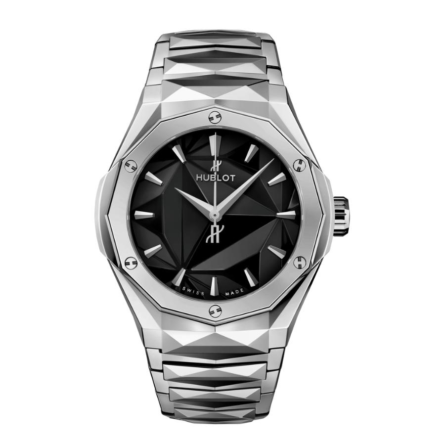 Đồng hồ Hublot Classic Fusion Titanium Orlinski Bracelet Titanium 40mm 550.NS.1800.NS.ORL22 là chiếc đồng hồ đánh dấu sự hợp tác giữa Hublot và nhà điêu khắc Richard Orlinski. Chế tác đồng hồ này mang bộ vỏ bằng chất liệu Titanium. Vành Bezel của đồng hồ cũng được hoàn thiện bằng chất liệu Titanium, được thiết kế cắt lớp theo phong cách nghệ thuật đặc trưng của Orlinski, bên cạnh đó, vành bezel được cố định bằng 6 đinh ốc hình chữ H là đặc trưng nhận diện của thương hiệu xa xỉ. Mặt số đồng hồ có kích thước 40mm cùng phối màu đen tuyền, sử dụng bộ cọc số được thiết kế hình mũi tên trong chất liệu Titanium, tạo nên tổng thể đồng bộ cho chiếc đồng hồ. Mặt kính chất liệu Sapphire với khả năng chống sốc và chống xây xước tuyệt vời, bảo vệ bộ máy của chiếc đồng hồ trong những hoạt động hằng ngày. Đi kèm là dây đeo Titanium cùng các mối nối được thiết kế cắt vát mô phỏng hoạ tiết của mặt số.