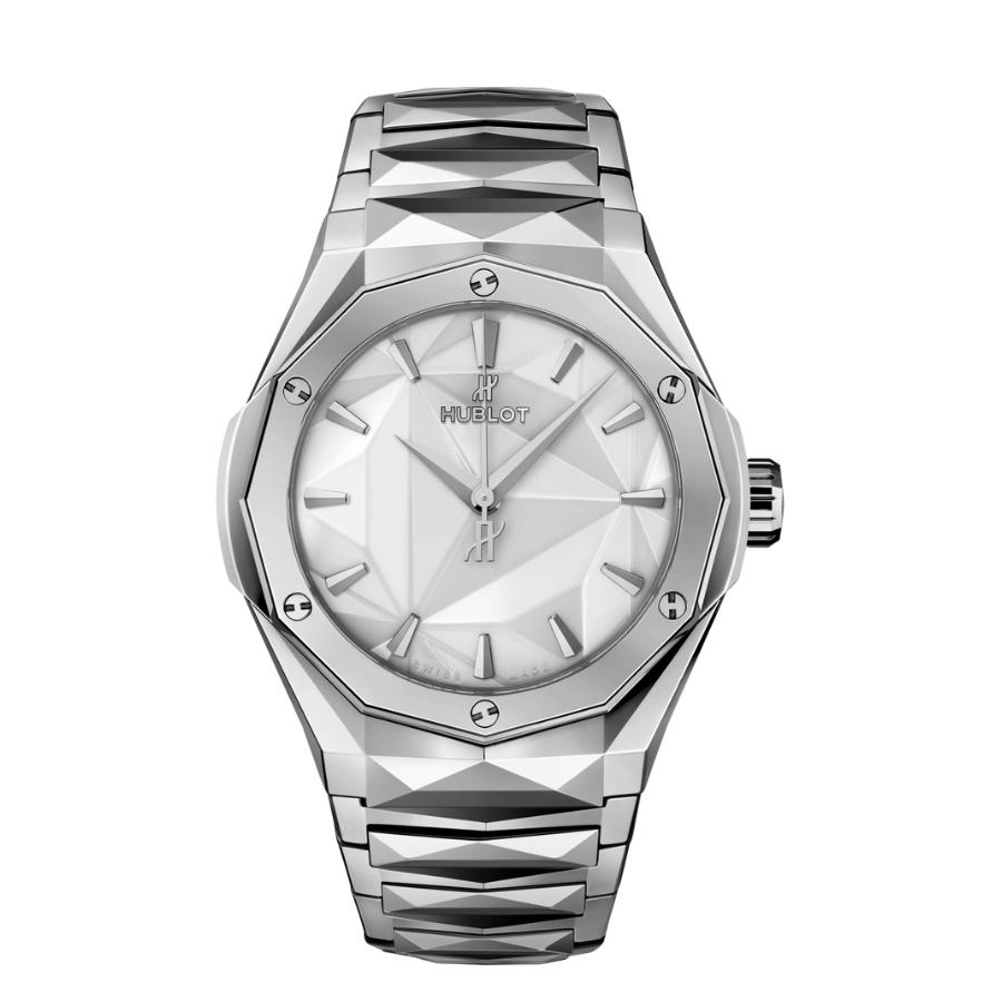 Đồng hồ Hublot Classic Fusion Titanium Orlinski Bracelet Titanium White 40mm 550.NS.2200.NS.ORL22 là chiếc đồng hồ đánh dấu sự hợp tác giữa Hublot và nhà điêu khắc Richard Orlinski. Chế tác đồng hồ này mang bộ vỏ bằng chất liệu Titanium. Vành Bezel của đồng hồ cũng được hoàn thiện bằng chất liệu Titanium, được thiết kế cắt lớp theo phong cách nghệ thuật đặc trưng của Orlinski, bên cạnh đó, vành bezel được cố định bằng 6 đinh ốc hình chữ H là đặc trưng nhận diện của thương hiệu xa xỉ. Mặt số đồng hồ có kích thước 40mm cùng phối màu trắng, sử dụng bộ cọc số được thiết kế hình mũi tên trong chất liệu Titanium, tạo nên tổng thể đồng bộ cho chiếc đồng hồ. Mặt kính chất liệu Sapphire với khả năng chống sốc và chống xây xước tuyệt vời, bảo vệ bộ máy của chiếc đồng hồ trong những hoạt động hằng ngày. Đi kèm là dây đeo Titanium cùng các mối nối được thiết kế cắt vát mô phỏng hoạ tiết của mặt số.
